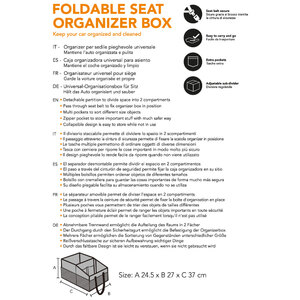 Organizer per sedile pieghevole, universale. Mantiene l'auto organizzata e pulita. Facile da trasportare. Tasche extra. Divisore regolabile. Il divisorio staccabile permette di dividere l'organizer in 2 scompartimenti. Le tasche multiple per mettono di ordinare oggetti di diverse dimensioni. Tasca con cerniera per riporre le cose importanti in modo molto più sicuro. Il design pieghevole lo rende facile da riporre quando non viene utilizzato. Può essere fissato grazie ad apposita predisposizione per cintura di sicurezza