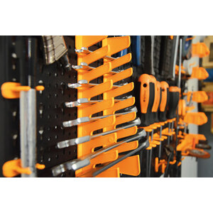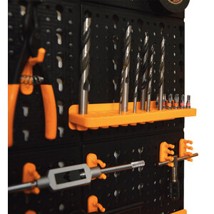 Pannello porta attrezzi da parete. L'ideale per attrezzare le pareti di garage e luoghi di lavoro. Resistenti e modulari, adatto a tutti i tipi di attrezzi. Prodotto in polipropilene. Non assorbe odori. Non trattiene umidità. Semplice sistema di assemblaggio. Prodotto italiano ecosostenibile. Kit composto da 73 pezzi: 4 pannelli 323x17x385mm; 15 contenitori (100x95x50mm); 12 contenitori (103x166x73mm); 2 mensole; 2 portachiavi; 38 ganci