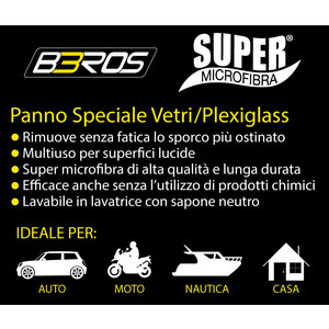 Panno vetri in ultra microfibra. Rimuove senza fatica lo sporco più ostinato. Pulisce, sgrassa e dona splendore a vetri, cristalli, superfici laccate. Non lascia aloni e pelucchi. Perfetto per le superfici lisce, ha un elevatissimo potere assorbente ed una incredibile resistenza. Microfibra di alta qualità. Efficace anche senza l'utilizzo di prodotti chimici. La sua particolare formula permette al panno, solo con acqua, un'azione pulente e immediata di ogni vetro specchio, riuscendo a pulire la superficie con una sola passata senza bisogno di asciugarla: dopo pochi secondi tornerà asciutta senza lasciare alcuna traccia di acqua. Di lunga durata. Lavabile in lavatrice con sapone neutro. Ideale per auto, moto, barca, casa, fai da te. Super Microfibra si usa bagnato e ben strizzato per: vetri, specchi, superfici plastiche lucide, superfici cromate, ecc. Stessa qualità in colori assortiti