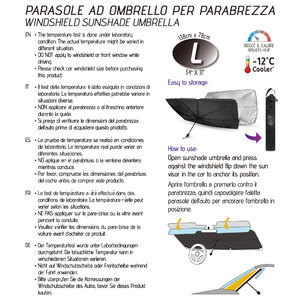 Parasole ad ombrello per parabrezza. Riduce il calore all'interno del veicolo. Il particolare design ad ombrello lo rende facile da aprire e chiudere in pochi secondi. Il formato universale si adatta alla maggior parte dei veicoli. Protegge l'interno della vettura da sole e calore UV. Telaio e superficie radianti per una copertura flessibile. Si prega di verificare le dimensioni del parabrezza dell'auto prima di acquistare questo prodotto. Dimensioni 138x78cm