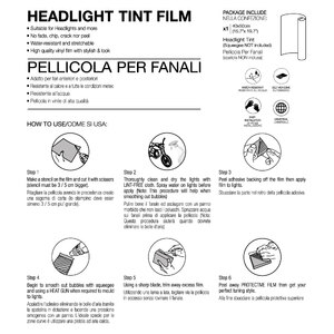 Pellicola per fanali. Adatto per fari anteriori e posteriori. Resistente al calore e a tutte le condizioni meteo. Resistente all'acqua. Pellicola in vinile di alta qualità. Autoadesiva. Installazione semplice. (Spatola non inclusa)