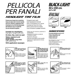 Pellicola per fanali. Protegge da sassi e graffi. Evita l'opacizzazione dei fanali. Offre un look aggressivo al tuo veicolo. Universale per auto, SUV e moto. Pellicola adesiva facile da installare. Si può rimuovere in qualsiasi momento. Adatto per fari anteriori, posteriori e fendinebbia. Resistente al calore e a tutte le condizioni meteo. Resistente all'acqua. Pellicola estendibile di alta qualità. Spatola per l'applicazione inclusa all'interno.