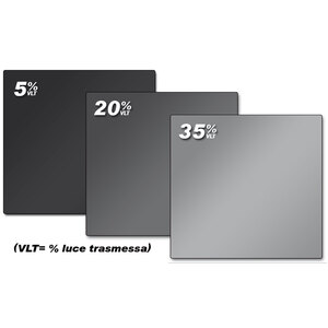 Fumè. Elimina il bagliore durante la guida. Aumenta la privacy. Protegge l'interno dell'auto dai raggi ultravioletti. In caso di rottura del vetro trattiene le schegge. 35% VLT (Visible Light Transmission). La pellicola lascia filtrare solo il 35% di luce. Omologata. Le pellicole oscuranti per vetri riducono l'aumento della temperatura all'interno dell'auto, creando un ambiente confortevole; inoltre riflettendo i raggi solari aiutano il condizionatore ottimizzando l'efficienza energetica ed il risparmio di carburante. Protegge dai raggi solari i sedili, il cruscotto e la tappezzeria riducendo l'effetto bagliore durante la guida. In caso di rottura dei vetri causa sassi o incidente trattiene le schegge dei cristalli proteggendo i passeggeri. Danno un effetto sportivo e personalizzato. Facile da installare
