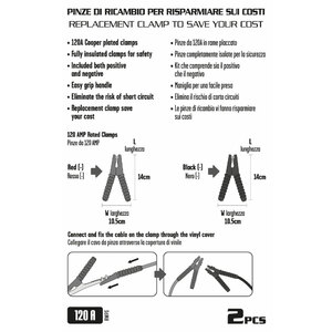 Pinze batteria di ricambio isolate 120A. In rame placcato. Pinze completamente isolate per maggiore sicurezza. Il kit comprende sia il positivo che il negativo. Maniglia che facilita la presa. Elimina il rischio di corto circuiti. Le pinze di ricambio faranno risparmiare sui costi