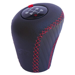 Pomello universale per retromarcia classica. Ecopelle nera carbon look. Cuciture rosse. 3 schemi marce intercambiabili