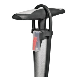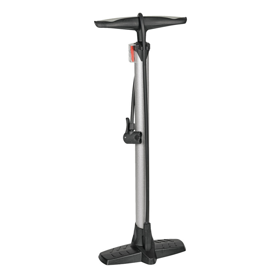 Pompa in acciaio H 600 mm D 35 mm. Struttura in metallo ad alta resistenza. Connettore per valvole Schrader, Presta, Regina. Impugnatura e base di dimensioni maggiorate in resina composita. Adattatori ed ago gonfia pallone in dotazione
