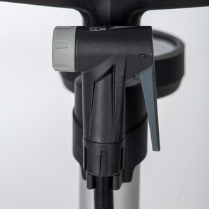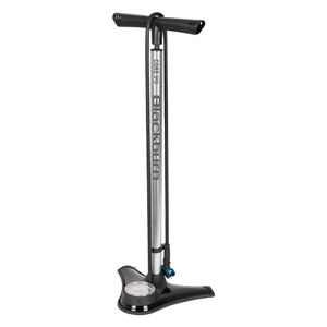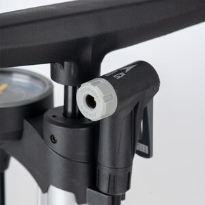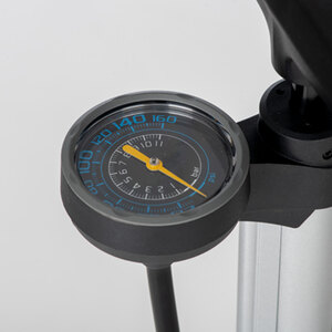 Pompa da pavimento in acciaio con manometro. Testa intelligente per l'uso con valvole Presta e Schrader. Canna e base in acciaio. Blocco valvola. Indicatore montato in alto. Pressione massima: 160 PSI