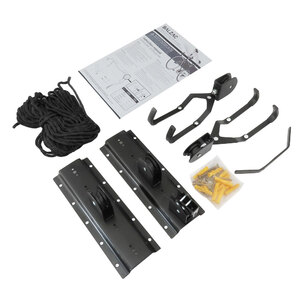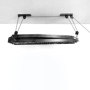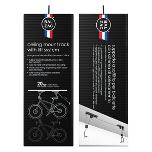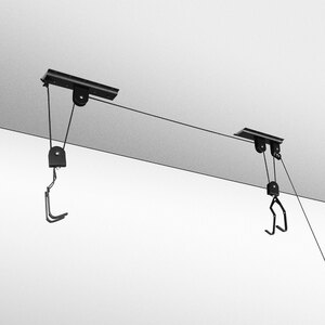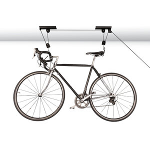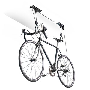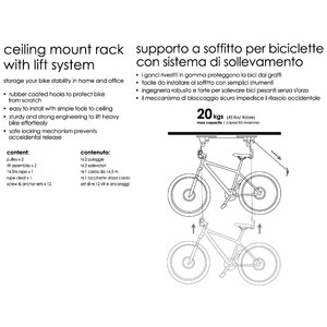 Supporto a soffitto per biciclette. Ideale anche per piccole riparazioni. I ganci rivestiti in gomma proteggono la bici da graffi. Semplice da installare. Il meccanismo di bloccaggio sicuro impedisce il rilascio accidentale. Max load 20kg