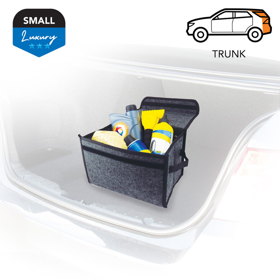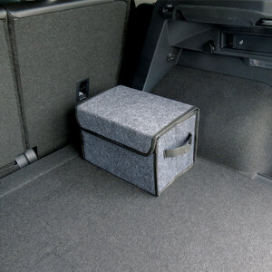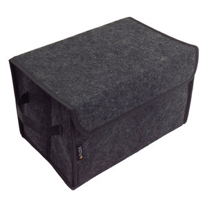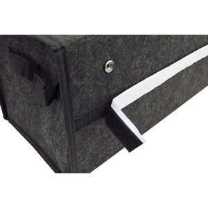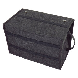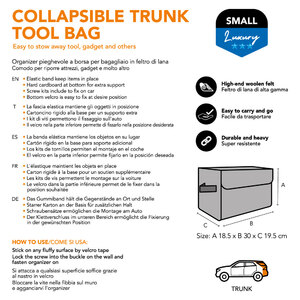 Organizer pieghevole a borsa, per bagagliaio, in feltro di lana. Comodo per riporre attrezzi, gadget e molto altro. La fascia elastica mantiene gli oggetti in posizione. Cartoncino rigido alla base per un supporto extra. I kit di viti permettono il fissaggio sull'auto. Il velcro nella parte inferiore permette di fissarlo nella posizione desiderata. Si attacca a qualsiasi superficie soffice grazie al nastro in velcro