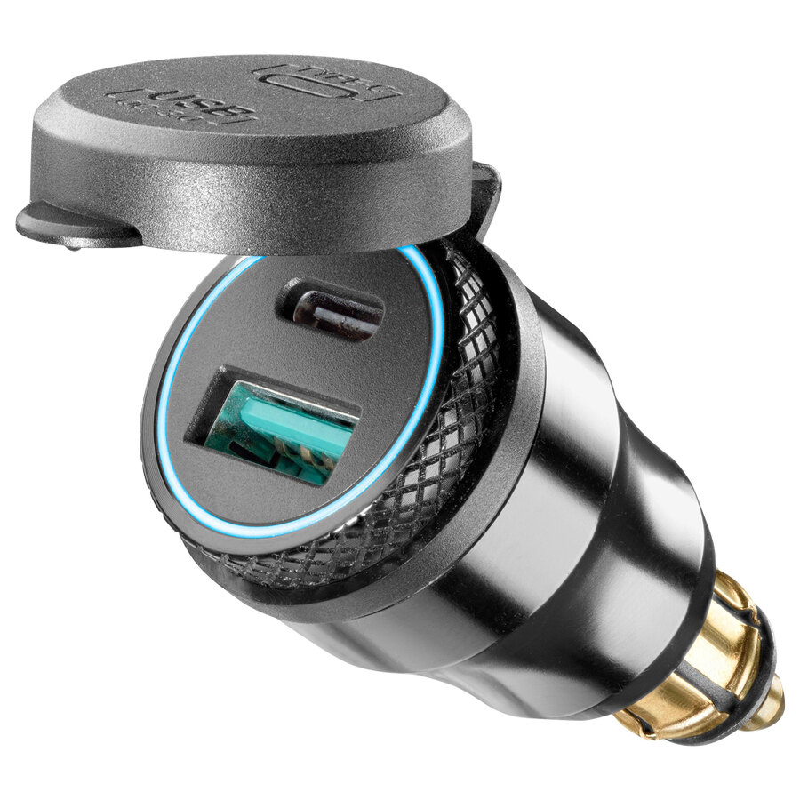 Adattatore da connettore DIN dotato di doppia porta USB in alluminio di cui una tipo C e una tipo A, consente di ricaricare due dispositivi elettronici. Grazie alla porta Type C la ricarica dei tuoi dispositivi sarà quindi rapida e veloce anche in motocicletta. Molto piccolo e compatto, è dotato di cappuccio di protezione ed è pratico e senza fili. Corpo completamente in alluminio per resistere alle intemperie. 4,2A