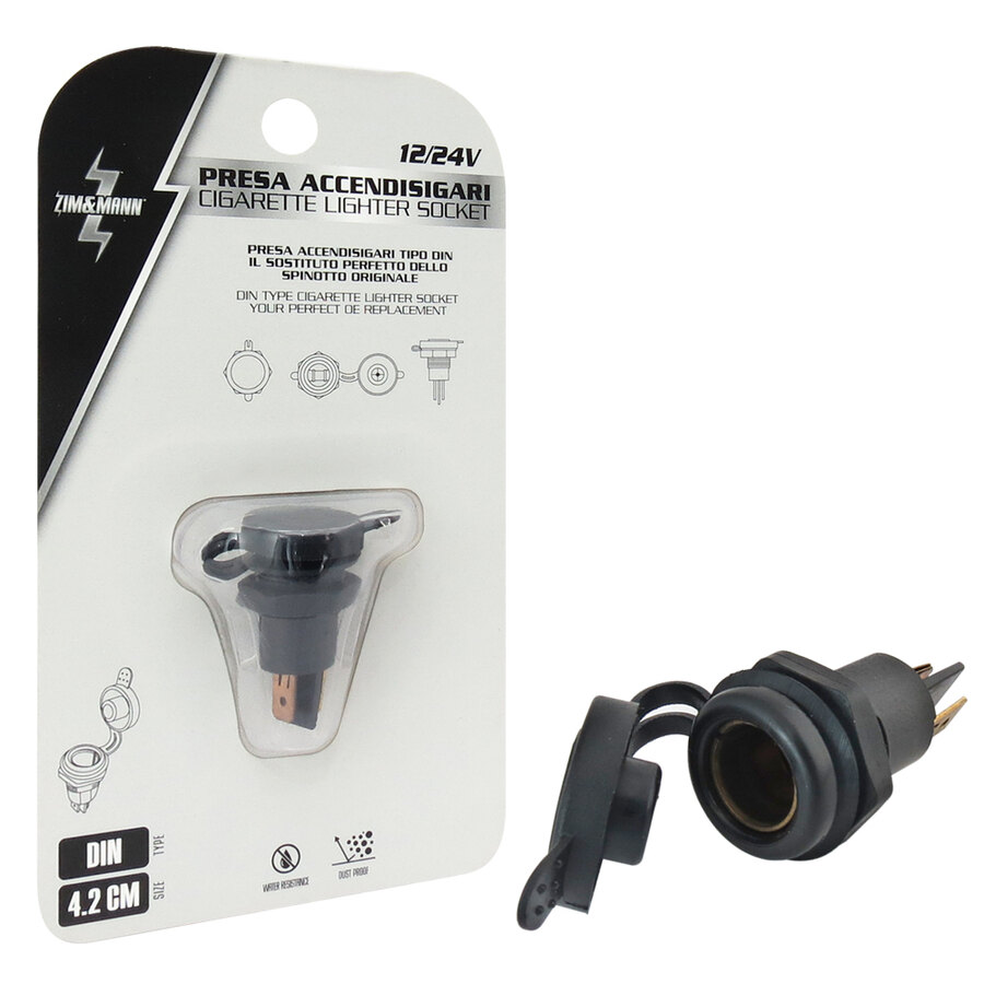 Presa accendisigari tipo DIN. Ottimo isolamento per evitare cortocircuiti. Copertura antipolvere ideale per uso interno ed esterno. Design speciale per prese di corrente tipo: Hella, DIN, BMW o BMW moto. Tensione elettrica 12/24V Lunghezza totale: 42mm Diametro interno: 13mm
