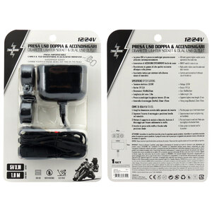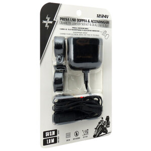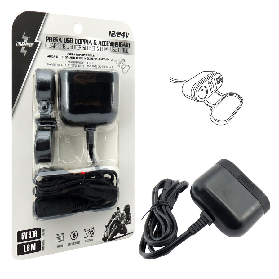 Doppia presa USB e accendisigari. Impermeabile. Carica il tuo smartphone in qualsiasi momento. La presa USB e la presa accendisigari possono essere utilizzate contemporaneamente. Interruttore Accensione/spegnimento facile da usare. Rivestimento in gomma di alta qualità resistente all'acqua e alla polvere. Cuscinetto incluso per adattarsi alle diverse misure di manubrio. Tensione elettrica: 12/24V Uscita 5V 3,1A Dimensioni: 50x80x32mm Lunghezza del cavo: 1,8m Presa accendisigari lunghezza interna: 33mm Intervallo di montaggio (staffa): 22>25mm