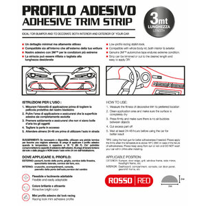 Profilo adesivo colorato. Flessibile e facilmente adattabile. Colore brillante e vistoso. Mini profilo adesivo dal look racing. Dettaglio minimal ma altamente stiloso. Utilizzabile sia all'interno che all'esterno dell'auto. Adesivo 3M. La strisicia può essere rifilata o tagliata alla lunghezza desiderata