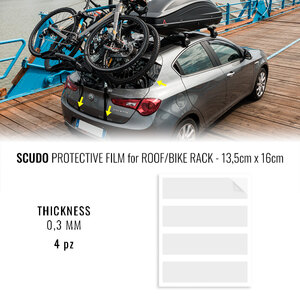 Pellicola autoadesiva trasparente dalle buone caratteristiche protettive. È indicata per proteggere in maniera efficace le zone di aggancio quali portelloni, portapacchi e portabici auto. L'elasticità e la resistenza di questo prodotto realizzano una vera barriera semielastica che preserva e respinge le aggressioni meccaniche e chimiche. In caso di danneggiamento superficiale è possibile ripristinare la sua condizione originale scaldando le scalfiture con un panno imbevuto di acqua calda. Confezione contenente una tabella di dimensione 13,5x16cm contenente 4 segmenti con spessore 0.3mm