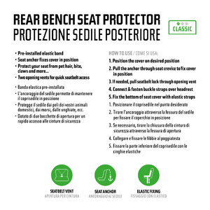 Protezione sedile posteriore. Banda elastica pre-installata. L'ancoraggio del sedile permette di mantenere il coprisedile in posizione. Protegge il sedile dai peli dei vostri animali domestici, dai morsi, dalle unghiate, ecc. Dotato di due bocchette di apertura per un rapido accesso alle cinture di sicurezza