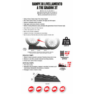 Rampe di livellamento a tre gradini (4-7-10cm). Regola il livello del vostro veicolo all'altezza desiderata. Realizzato in polipropilene robusto e durevole. Ideale per Camper, Caravan, furgoni, Trailer, Camper furgonati. Offre 3 diverse opzioni di altezza, per rispondere alla maggior parte delle esigenze. Design leggero, anticorrosivo, antiscivolo e strutturale. Mantiene il veicolo perfettamente in piano, permettendo alle apparecchiature di bordo di funzionare meglio. Max load 3t. Larghezza massima pneumatico 20cm