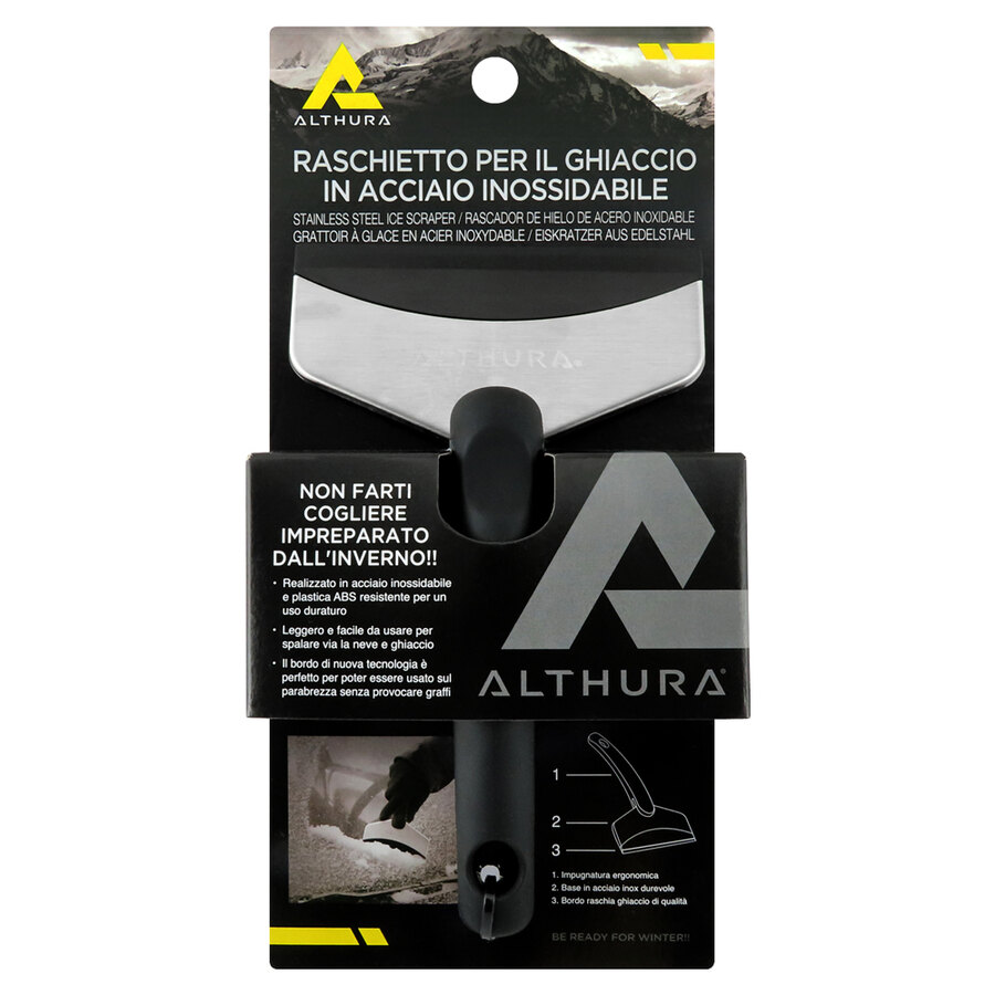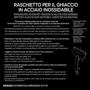 Raschietto per il ghiaccio in acciaio inossidabile. Strumento indispensabile per le condizioni invernali. Dimensioni compatte per poter essere trasportato e conservato facilmente. Realizzato in acciaio inossidabile e plastica ABS resistente per un uso duraturo. Leggero e facile da usare per spalare via la neve e ghiaccio. Il bordo di nuova tecnologia è perfetto per poter essere usato sul parabrezza senza provocare graffi. Impugnatura ergonomica