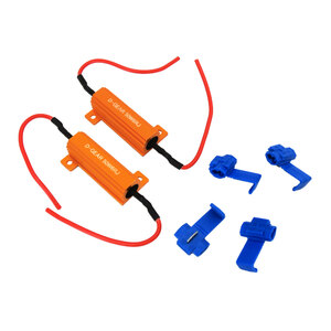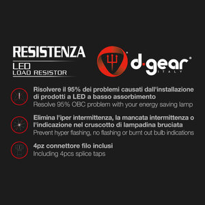 Le resistenze di carico vengono utilizzate per risolvere i problemi di intermittenza iper veloce, mancanza di lampeggio o accensione della spia del cruscotto. La funzione delle resistenze è quella di simulare il carico di corrente o assorbirne maggiormente per imbrogliare il computer di bordo assicurando così la possibilità di installare le lampadine a LED. Ogni LED necessita di una resistenza. Resistenza 12/24V 50W 6 Ohm cementata Risolve il 95% dei problemi causati dall'installazione di prodotti LED a basso assorbimento. Elimina l'iper intermittenza, la mancata intermittenza o l'indicazione nel cruscotto di lampadina bruciata. La confezione contiene 2 resistenze e 4 clips necessari per una corretta installazione. Si consiglia l'installazione su parti metalliche per via del calore prodotto dalla resistenza