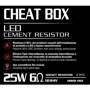 Le resistenze di carico vengono utilizzate per risolvere i problemi di intermittenza iper veloce, mancanza di lampeggio o accensione della spia del cruscotto. La funzione delle resistenze è quella di simulare il carico di corrente o assorbirne maggiormente per imbrogliare il computer di bordo assicurando così la possibilità di installare le lampadine a LED. Ogni LED necessita di una resistenza. Resistenza 12/24V 25W 6 Ohm cementata Risolve il 95% dei problemi causati dall'installazione di prodotti LED a basso assorbimento. Elimina l'iper intermittenza, la mancata intermittenza o l'indicazione nel cruscotto di lampadina bruciata. La confezione contiene 2 resistenze e 4 clips necessari per una corretta installazione. Si consiglia l'installazione su parti metalliche per via del calore prodotto dalla resistenza
