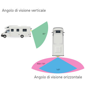 Retrocamera universale per Camper con visione notturna ed assetto regolabile. Tecnologia CMOS 1/4" a colori NTSC. Visione notturna con infrarossi. IP68 resistente all'acqua. Angolo massimo di visione Orizzontale 170°. Angolo di ripresa senza distorsione H 120°/ V 75°. Sensibilità notturna 0.2 Lux. Risoluzione H733xV493 pixel. Risoluzione orizzontale 420 linee TV. Rotazione della immagine (Normale o Mirror). Linee guida per il parcheggio (On / Off). Tensione di esercizio da 11 a 36 Volt. Connessione Aviation. Aletta parasole regolabile. Lunghezza del cavo Video Aviation 10m. Dimensioni 76xh78mm