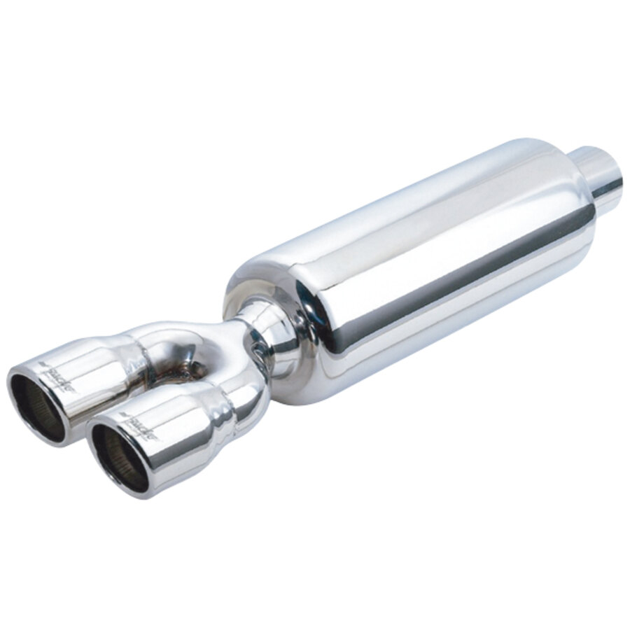 Scarico universale lucidato a specchio. Rotondo in inox, uscita rotonda doppia. Diametro entrata 55mm, lunghezza cassa 330mm, diametro cassa 114mm. Diametro terminale 2x63mm. Lunghezza terminale 560mm