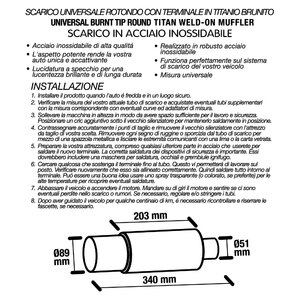 Scarico universale rotondo con terminale in titanio brunito. Realizzato in robusto acciaio inossidabile. Lucidatura a specchio per una lucentezza brillante e di lunga durata. L'aspetto potente rende la vostra auto unica e accattivante. Misura universale. Facile da installare. Diametro di ingresso: 48mm Lunghezza del corpo: 203mm Diametro del corpo: 102mm Diametro di uscita rotondo: 89mm Lunghezza totale: 340mm