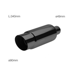 Scarico universale verniciato nero cassa silenziatore rotonda. Diametro entrata 49mm, lunghezza cassa 205mm, diametro cassa 102mm, diametro terminale 90mm, lunghezza terminale 340mm