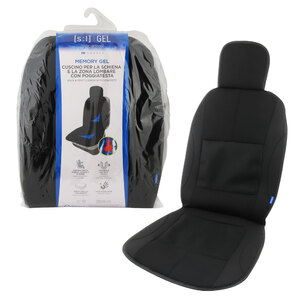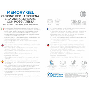 Supporto per la schiena, i fianchi e le gambe. Offre comfort e supporto sia alla parte posteriore del corpo che alla schiena. Aiuta a migliorare la postura, a spostare la pressione e a favorire il flusso sanguigno. Con copri-poggiatesta. Imbottitura ad alta densità. La fascia elastica si adatta alla maggior parte dei sedili auto. Auto modellante. Universale per tutti i veicoli. Con speciale copertura in rete ventilata. La tecnologia Memory Gel garantisce il massimo comfort: rilassa i punti di pressione, calma le tensioni muscolari e mantiene una temperatura fresca