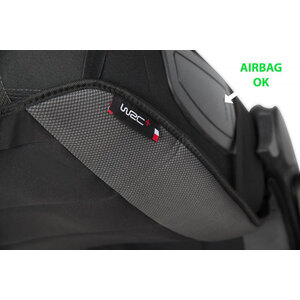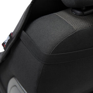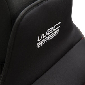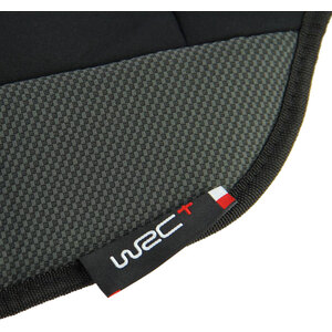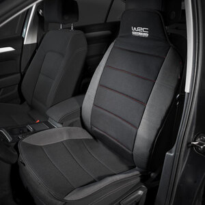 Coprisedile singolo. In tessuto nero con cuciture rosse e logo. WRC ricamato sul poggistesta auteriore. Semplice sistema di fissaggio. Universale