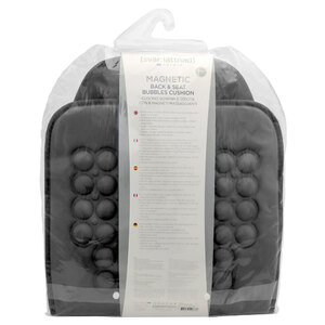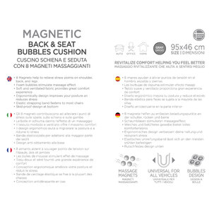 Cuscino schiena e seduta con 8 magneti massaggianti. Gli 8 magneti contribuiscono ad alleviare i punti di stress sulle spalle, schiena e gambe. Le bolle in schiuma danno l'effetto di un massaggio. Contribuisce a rilassare i muscoli tesi e ad alleviare i disturbi. Il tessuto morbido e ventilato offre il massimo comfort. Il design ergonomico aiuta a migliorare la postura e a ridurre lo stress. Aiuta a prevenire il mal di schiena dovuto a una prolungata posizione seduta. Ideale per l'uso in auto, a casa o in ufficio. Il sistema a strap permette di allacciarlo alla maggior parte dei sedili. Design anti-slittamento alla base. Un unico prodotto permette di rinnovare l'aspetto dei vecchi e sporchi sedili auto. Eccezionale capacità di ammortizzare gli urti