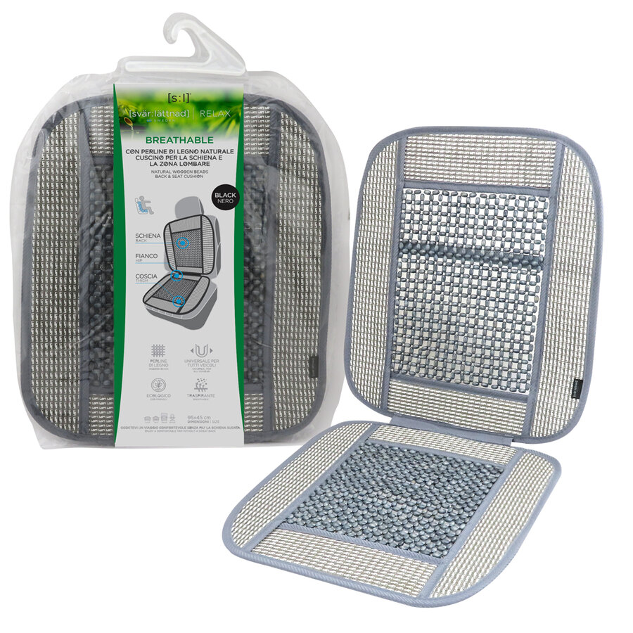Cuscino per la schiena e la zona lombare. Con sfere di legno naturale. Universale per tutti i veicoli. Eco Friendly. Traspirante. Le perle di legno naturale offrono una buona ventilazione e consentono la circolazione dell'aria prevenendo il sudore causato da periodi di seduta prolungata. Le perle di legno hanno un effetto massaggiante, aiutano ad accellerare la circolazione sanguigna e ad alleviare il dolore alla schiena causato da una seduta prolungata. Il tessuto traspirante e delicato sulla pelle aiuta a rimanere freschi. Le sfere di legno sono intrecciate con un filo di poliuretano per prolungarne la durata