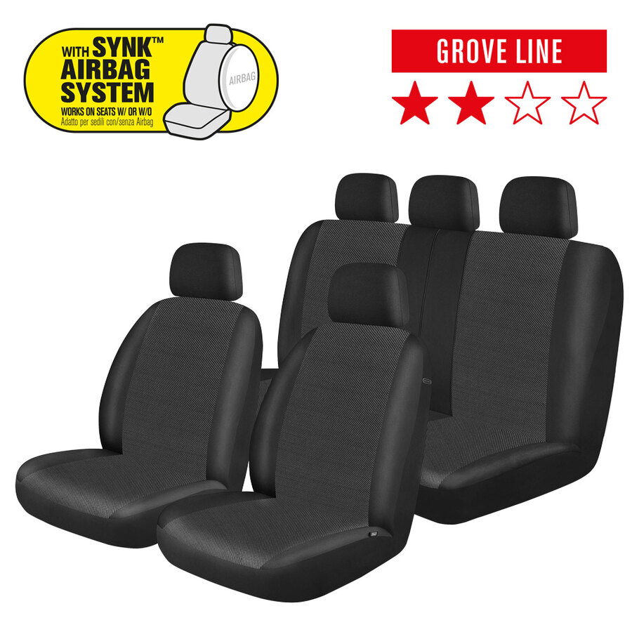 Set coprisedili universali. Adatto a sedile anteriore tradizionale (e poggiatesta separato regolabile) & posteriore a panca. Per quasi tutte le AUTO/SUV con sedili di misura standard. Schienale posteriore divisibile con zip. Con imbottitura in spugna. Lavabile a mano 30°. Design classico per rinnovare l'aspetto degli interni della vostra auto. Per proteggere il sedile da fuoriuscite di liquidi, macchie, sporco, peli di animali, lacerazioni e molto altro ancora... Progettato con la tecnologia SYNK, consente l'apertura degli airbag. Materiale di alta qualità con speciale gomma piuma per garantire durata, protezione e comfort