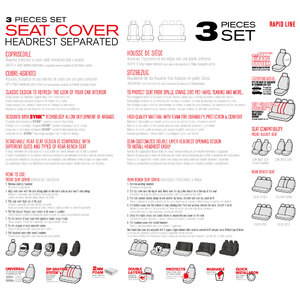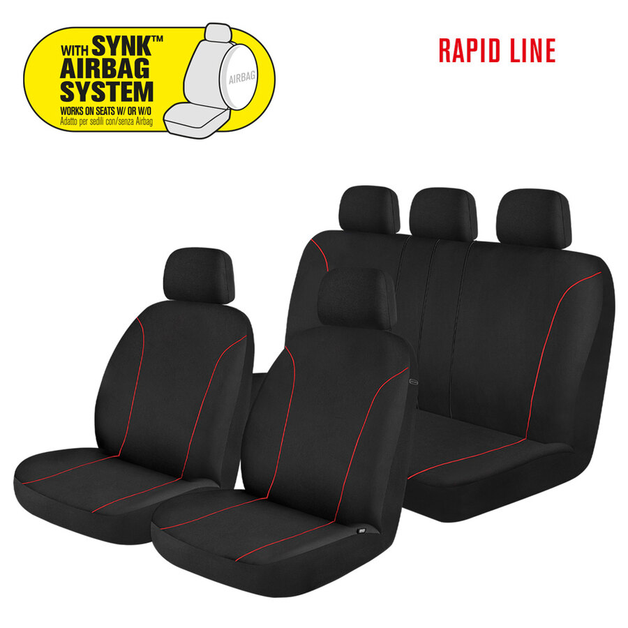 Coprisedili universali per auto/SUV con sedile anteriore di misura standard (con poggiatesta separato regolabile) e posteriore a panca. Massima protezione ai sedili rinnovando look e aspetto. Schienale posteriore divisibile con zip. 2mm Foam: con imbottitura in spugna. Protegge da macchie, sporco, peli di animale, ecc... Lavabile a mano 30°. Installazione rapida. Progettato con la tecnologia Synk: consente l'apertura degli airbag. Apertura del poggiatesta a doppio strato con design semi-personalizzato per installare facilmente il poggiatesta. Contenuto: 2 coprisedili ant.schienale e seduta; 1 coprisedile a panca posteriore (copri poggiatesta per la parte anteriore/posteriore)