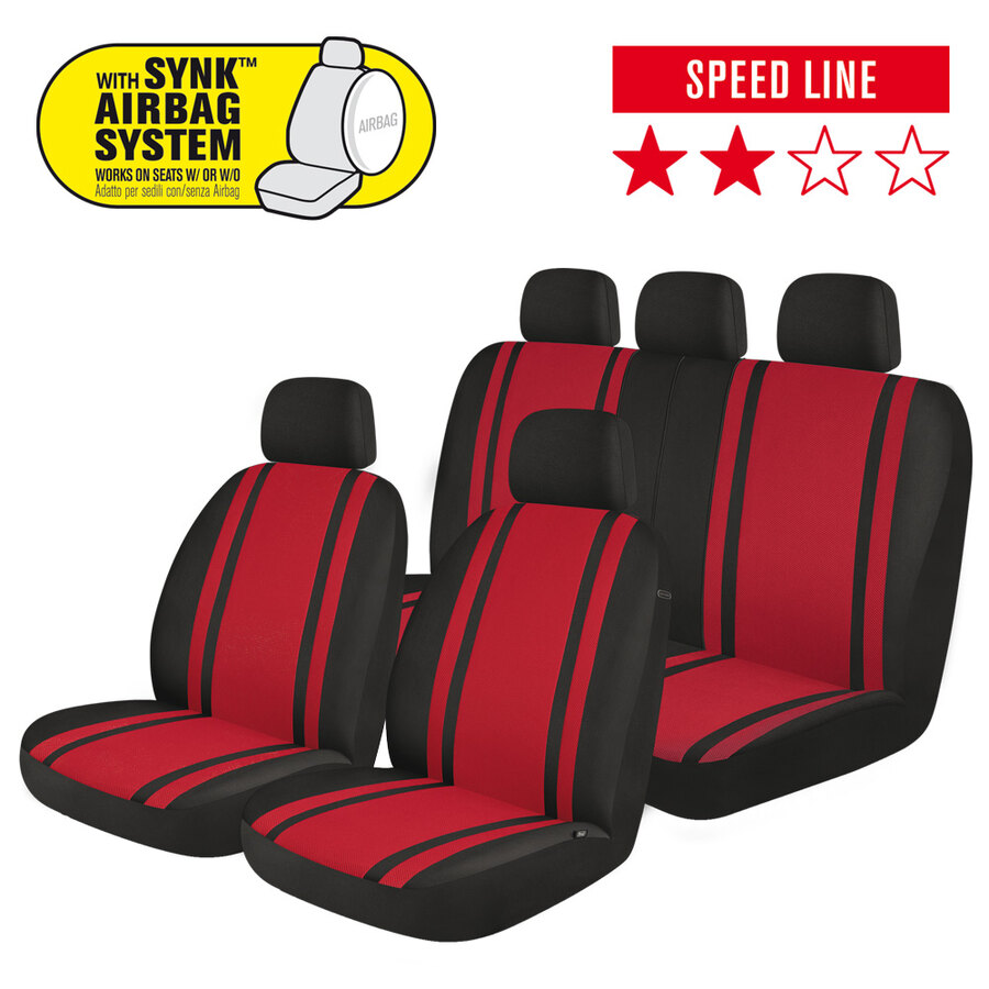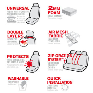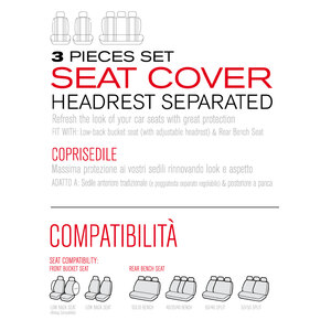 Coprisedili universali per auto/SUV con sedile anteriore di misura standard (con poggiatesta separato regolabile) e posteriore a panca. Design classico per rinnovare l'aspetto degli interni della vostra auto. Progettati con la tecnologia Synk, consente l'apertura degli airbag. Adatto per sedili con e senza airbag. Il particolare design dei coprisedili posteriori ne garantisce la compatibilità con diversi formati e modelli di sedili grazie allo schienale divisibile con zip. Utili per proteggere il sedile da macchie, sporco, peli di animali, lacerazioni e molto altro... Realizzati in materiali di alta qualità con speciale rivestimento interno in gomma piuma per garantire maggiore durata, protezione e comfort. Apertura del poggiatesta a doppio strato con design semi-personalizzato per installare facilmente il poggiatesta. Contenuto: 2 coprisedili anteriori schienale e seduta; 1 coprisedile a panca posteriore (copri poggiatesta inclusi per la parte anteriore/posteriore del sedile)