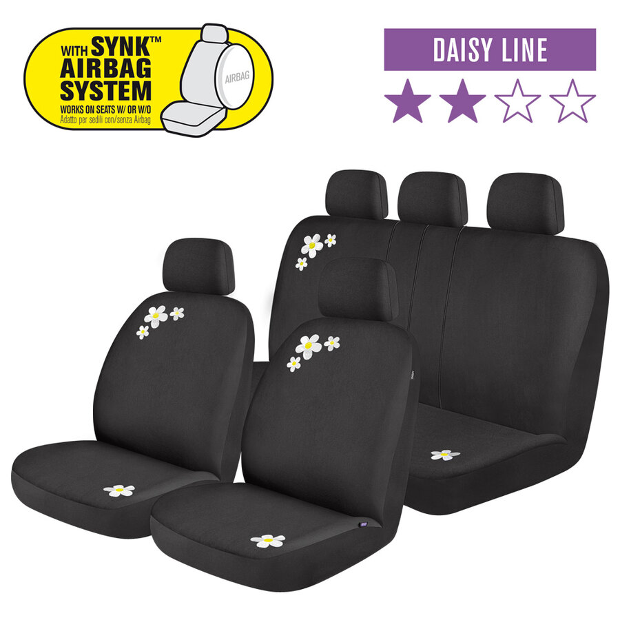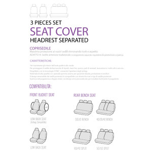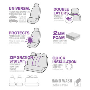 Coprisedili universali per auto/SUV con sedile anteriore di misura standard (con poggiatesta separato regolabile) e posteriore a panca. Massima protezione ai vostri sedili rinnovando look e aspetto. Progettati con la tecnologia Synk, consentono l'apertura degli airbag. Schienale sedile posteriore divisibile con zip. Utile per proteggere il sedile da macchie, sporco, peli di animali e molto altro ancora... Materiale di alta qualità con speciale gomma piuma per garantire durata, protezione e comfort. Apertura del poggiatesta a doppio strato con design semi-personalizzato per una facile installazione. Lavabile a mano 30°. Installazione rapida