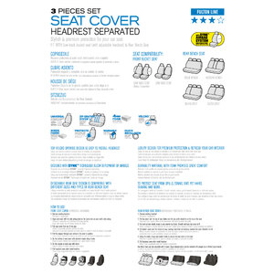 Set coprisedili universali. Adatto a sedile anteriore tradizionale (e poggiatesta separato regolabile) & posteriore a panca. Massima protezione ai vo stri sedili rinfrescando look e aspetto. Per quasi tutte le AUTO/SUV con sedili di misura standard. Schienale posteriore divisibile con zip. Montaggio rapido del poggiatesta con apertura/chiusura con Velcro. Lavabile a mano 30°. Materiale di alta qualità con speciale gomma piuma alta dal grande comfort. Progettato con la tecnologia SYNK, consente l'apertura degli airbag. Per proteggere il sedile da fuoriuscite di liquidi, macchie, sporco, peli di animali, lacerazioni e molto altro ancora..