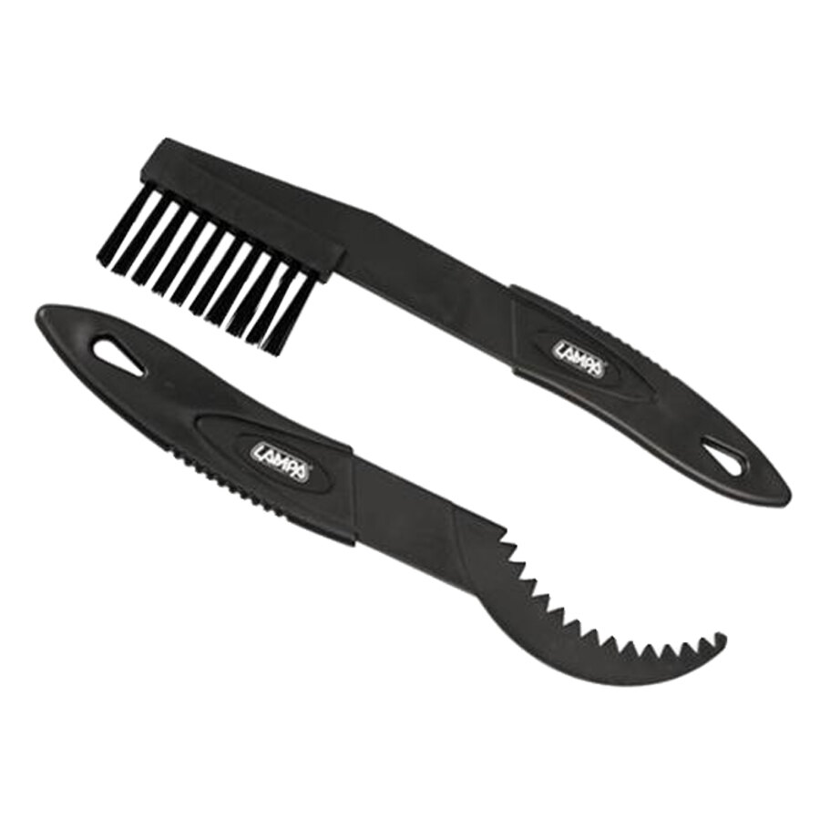Coppia di resistenti spazzole in PVC. Puliscono in modo facile e veloce raggiungendo gli angoli più nascosti. La spazzola pulisce corona, pignone e catena, mentre la mezzaluna dentata è specifica per la rimozione dello sporco accumulato tra i vari ingranaggi