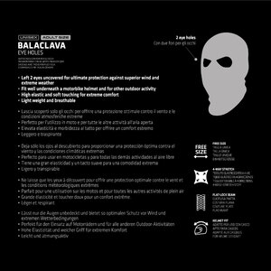 Sottocasco con fori per gli occhi. Lascia scoperti solo gli occhi per offrire una protezione ottimale contro il vento e le condizioni atmosferiche estreme. Perfetto per l'utilizzo in moto e per tutte le altre attività all'aria aperta. Elevata elasticità e morbidezza al tatto per orire un comfort estremo. Leggero e traspirante. Tessuto elasticizzato a 4 vie