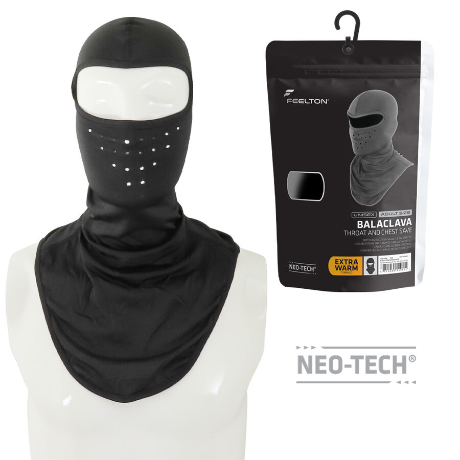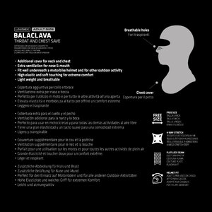 Sottocasco con salvagolae salvapetto. Copertura aggiuntiva per collo e torace. Ventilazione extra per naso e bocca. Perfetto per l'utilizzo in moto e per tutte le altre attività all'aria aperta. Elevata elasticità e morbidezza al tatto per offrire un comfort estremo. Leggero e traspirante. Tessuto elasticizzato a 4 vie