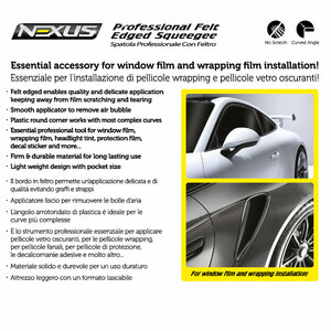 Spatola professionale con feltro. Bordo in feltro per un'applicazione delicata e di qualità evitando graffi e strappi. Doppia nervatura. Applicatore liscio utile per rimuovere le bolle d'aria. L'angolo arrotondato di plastica è ideale per le curve più complesse. Materiale solido e durevole per un uso duraturo. E' lo strumento professionale essenziale per applicare pellicole vetro oscuranti, per le pellicole wrapping, per pellicole fanali, per pellicole di protezione, le decalcomanie adesive e molto altro... Formato tascabile