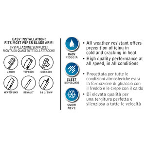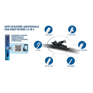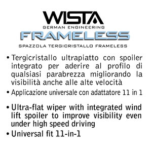 Spazzola tergicristallo Frameless. German Engineering. Tergicristallo ultra piatto con spoiler integrato per aderire al profilo di qualsiasi parabrezza migliorando la visibilità anche alle alte velocità. Progettata per tutte le condizioni atmosferiche: evita la formazione di ghiaccio con il freddo e le crepe con il caldo. Di elevata qualità per una tergitura perfetta e silenziosa a tutte le velocità. Applicazione universale con adattatore 11 in 1. Installazione semplice. Monta su quasi tutti gli attacchi.