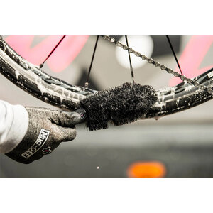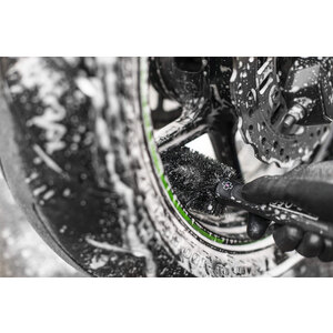 Spazzola modellata e sagomata appositamente per pulire con facilità cerchi, raggi e freni. Setole in nylon durevoli. Impugnatura resistente