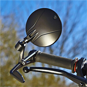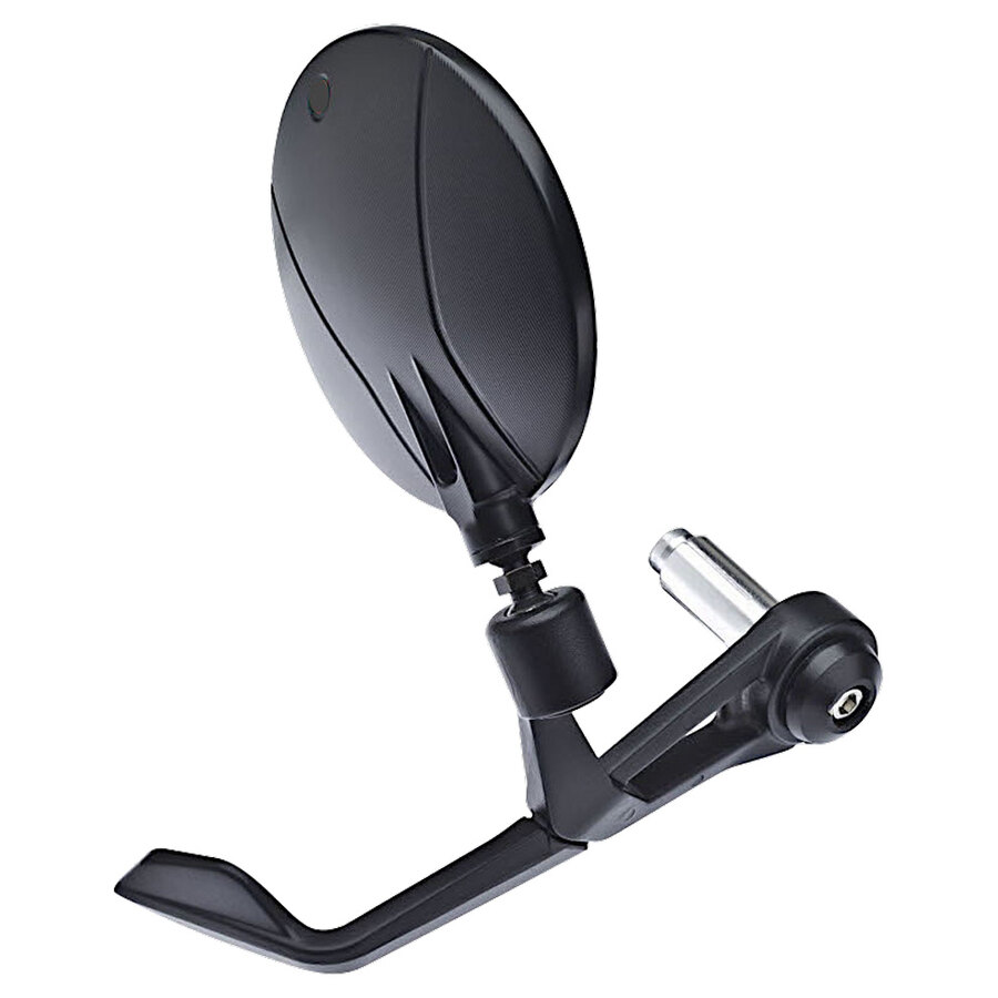 Retrovisore Bar End con paraleva totalmente in alluminio nero. Design innovativo, rivoluzionario per tutte le moto, di gran design, funzionalità e sicurezza grazie al paraleva incluso. Lunghezza 180 mm. Attacco regolabile expander da diam. 13 a 22mm oppure a manubrio diam. 20,5mm. Omologato