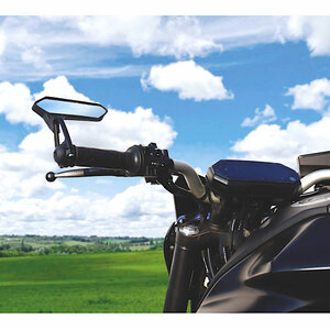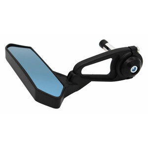 Specchio retrovisore con attacco Bar End. Vetro panoramico dentro sagoma. Realizzato in alluminio e policarbonato, completato con vetro azzurrato antiriflesso. Sinistro. Misure : lunghezza 144mm. Altezza 120mm. Attacco regolabile expander da diam 13 a 22mm. Confezione: 1 pezzo
