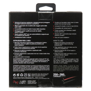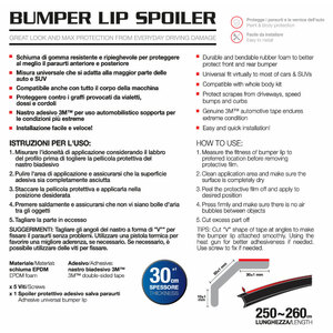 Spoiler protettivo adesivo salva paraurti. Protegge i paraurti e la vernice dell'auto. Facile da installare. Realizzato in schiuma EPDM. Schiuma di gomma resistente e ripieghevole per proteggere al meglio il paraurti anteriore e/o posteriore. Misura universale che si adatta alla maggior parte delle auto e SUV. Compatibile anche con tutto il corpo della macchina. Protegge contro i graffi provocati da vialetti, dossi e cordoli. Nastro adesivo 3M per uso automobilistico. Lunghezza ca 250cm