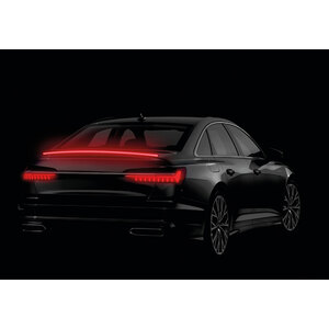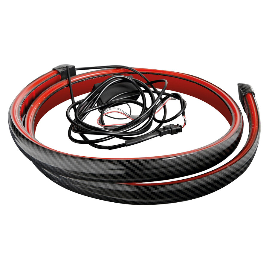 Spoiler carbon-look adesivo con integrata striscia luminosa a led rossi. Lunghezza 120cm. 12V. 2 funzioni: luce di posizione (funzione sequenziale all'attivazione) e luce freno (fascio luce di maggiore intensita). Uso posteriore, per montaggio su qualsiasi superficie liscia (tetto, spoiler, baule...). Migliora l'estetica dell'auto. Aumenta la visibilità dell'auto durante la guida garantendo maggiore sicurezza. Fissaggio semplice tramite adesivo senza necessità di forare. Realizzato in PVC flessibile di alta qualità. Impermeabile IP67 e resistente ai lavaggi auto. (N.B.: prodotto non omologato per uso stradale)