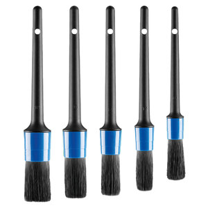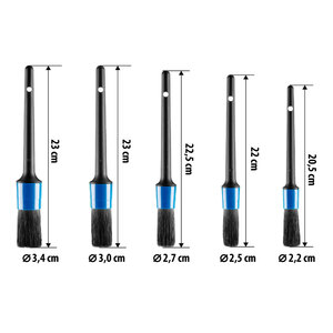 Kit 5 pennelli professionali per detailing auto. Morbide setole antigraffio in PET+PTB. Manico in plastica antiscivolo. Ideali per cruscotto, bocchette di aerazione, pulsanti, interruttori, tastiere, computer, griglie... Indispensabili per le piccole fessure non raggiungibili con un comune panno. La speciale fibra spolvera e trattiene le particelle di polvere lasciando la superficie pulita. Diam. pennelli: 3,4cm; 3,0cm; 2,7cm; 2,5cm; 2,2cm