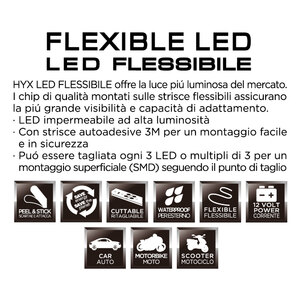 HYX Flessibile offre la luce più luminosa del mercato. I chip di qualità montati sulle strisce flessibili (SDM) assicurano la più grande visibilità e capacità di adattamento. LED impermeabile ad alta luminosità. Con strisce autoadesive 3M per un montaggio facile e in sicurezza. Può essere tagliata ogni 3 LED o multipli di 3 seguendo il punto di taglio. Adattabile, ritagliabile, durevole. Una luce super luminosa mai vista. 12V. Ideale per applicazioni su auto, moto e motocicli