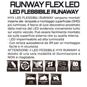 HYX Flessibile Runaway vengono montati assieme alle lampade a montaggio superficiale (SMD) più luminose. Il fascio di luce decorativo proiettato sulla matrice del LED evidenzia visivamente tutto sul vostro veicolo. Puo' essere facilmente montato sia sulla superficie esterna che su quella interna. LED impermeabile ad alta luminosità. Con strice autoadesive da 3M per un montaggio facile e sicuro. ATTENZIONE: il led flessibile Runaway è dotato di una sola modalità di illuminazione e NON è ritagliabile. 12V. Adatto per applicazioni su auto, moto, scooter.