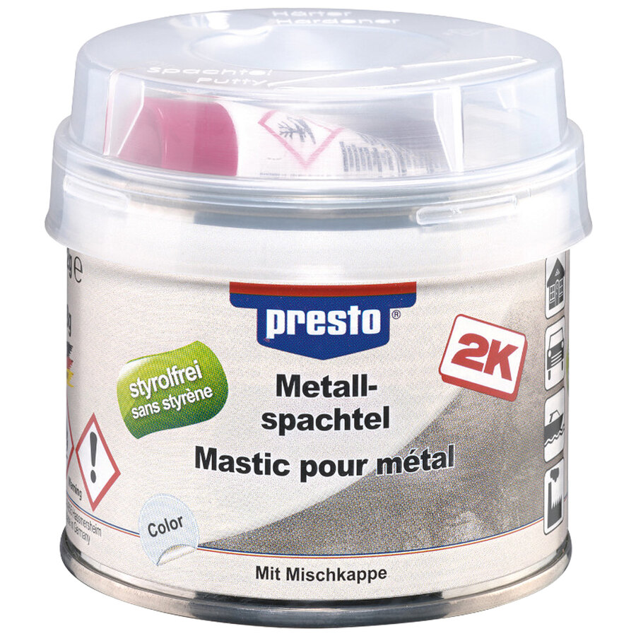 Stucco per metallo senza stirene. E' uno stucco poliestere bicomponente per metalli con diversi agenti di carica ecologici e pigmenti di alluminio. Utilizzabile come stucco riempitivo per la riparazione di autovetture, per macchinari e per gli hobby. Per tutti gli ambiti in cui è richiesta una contrattilità superficiale estesa. Le superfici come il metallo, il legno, diverse materie plastiche e il calcestruzzo possono essere stuccate senza fatica nello spessore necessario. I buchi vengono riempiti e pareggiati, i punti assottigliati vengono stabilizzati. Facile da lavorare. Elevata elasticità. Altamente tixotropico, quindi particolarmente adatto ad essere spatolato su superfici estese senza creare pori. Aderenza molto buona. Facile da levigare. Senza amianto né silicone. Resiste agli acidi e alle basi deboli, ai carburanti, ai solventi, all'acqua e ai sali antigelo